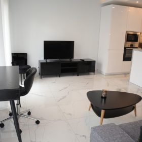 The open-plan and versatile living space features a well-equipped kitchen for all your culinary needs, a dining area, and a bright, spacious living room. Another feature of this contemporary apartment is a large TV to keep you entertained, while the dedicated study area provides a well-lit place to focus on work or studies.