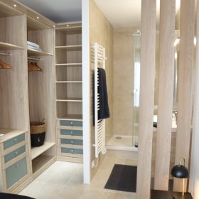 Because the property is south-facing, sunlight streams through the two large windows, creating a warm ambience all year round. On entering, you find a well-equipped kitchen and dining area with ample storage space. A small closet tucked neatly away helps maintain the spacious, clean, tidy living area. The cleverly designed bedroom has a walk-in wardrobe, an en-suite shower room, and a comfortable double bed, perfect for a restful night’s sleep.