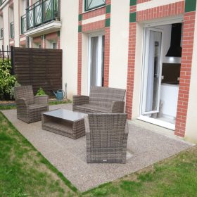 This delightful apartment is not just tastefully decorated and furnished, but it also boasts a well-equipped kitchen and dining area, and tiled flooring throughout. In addition, there is the luxury of a large securely fenced corner garden with a tiled terrace. So, on warm days and evenings, extend your living and entertaining space by stepping outside and enjoying your private 50m² garden, furnished with comfortable outdoor furniture.