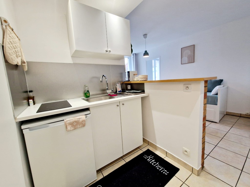 Stairs from the courtyard lead to this first-floor apartment. As you enter, you are welcomed by a bright living area featuring a high table with chairs and an open-concept kitchenette equipped with everything you may need – including a coffee machine for those early mornings or late study sessions.