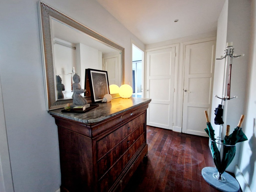 Upon entering, a central hallway leads to the apartment’s three main areas; the living space is bright and welcoming, featuring a dedicated dining area and a study corner – perfect for working or studying from home. From the hallway, you also access the recently renovated, sun-filled kitchen, fully equipped to the smallest detail and featuring a large American-style refrigerator, ideal for longer stays.