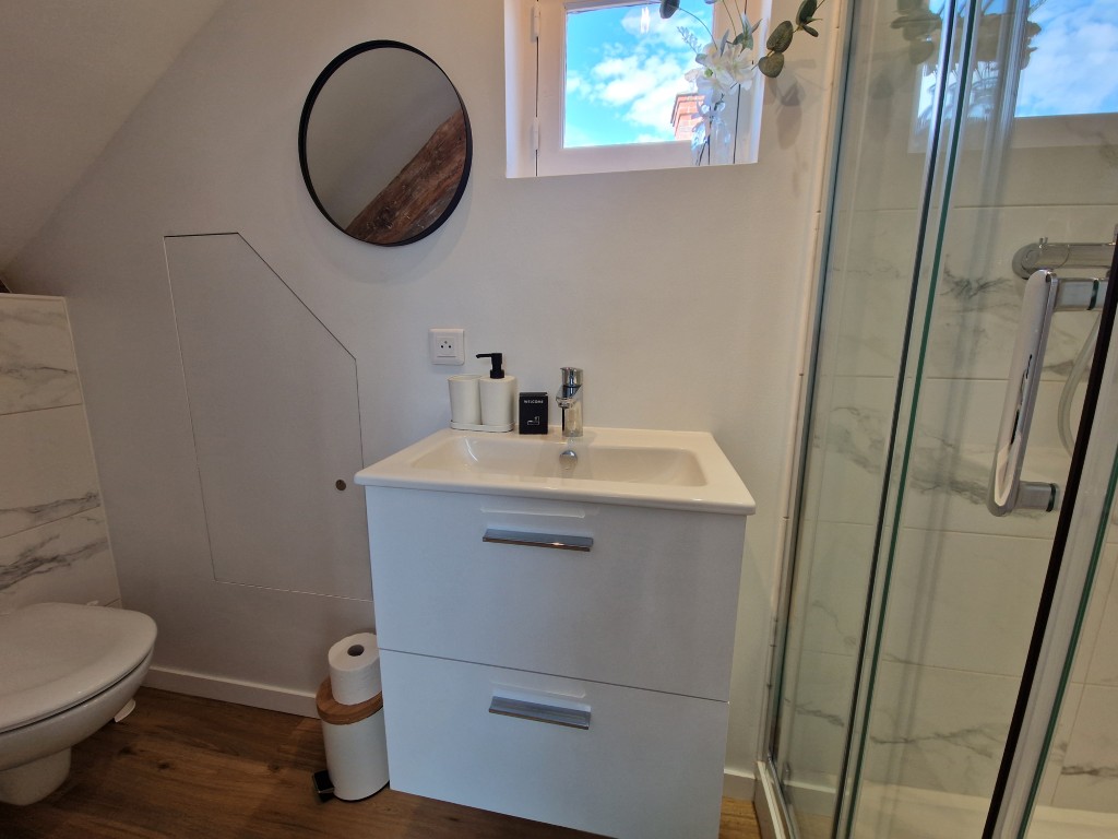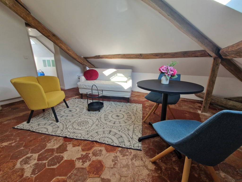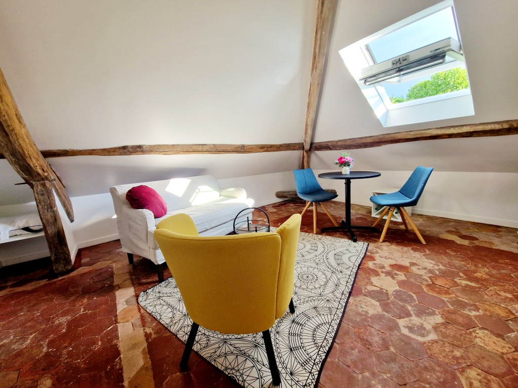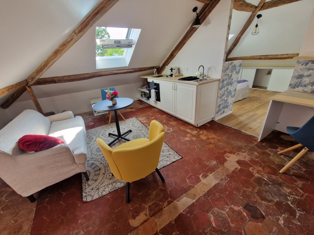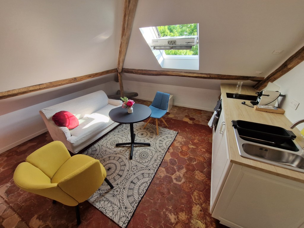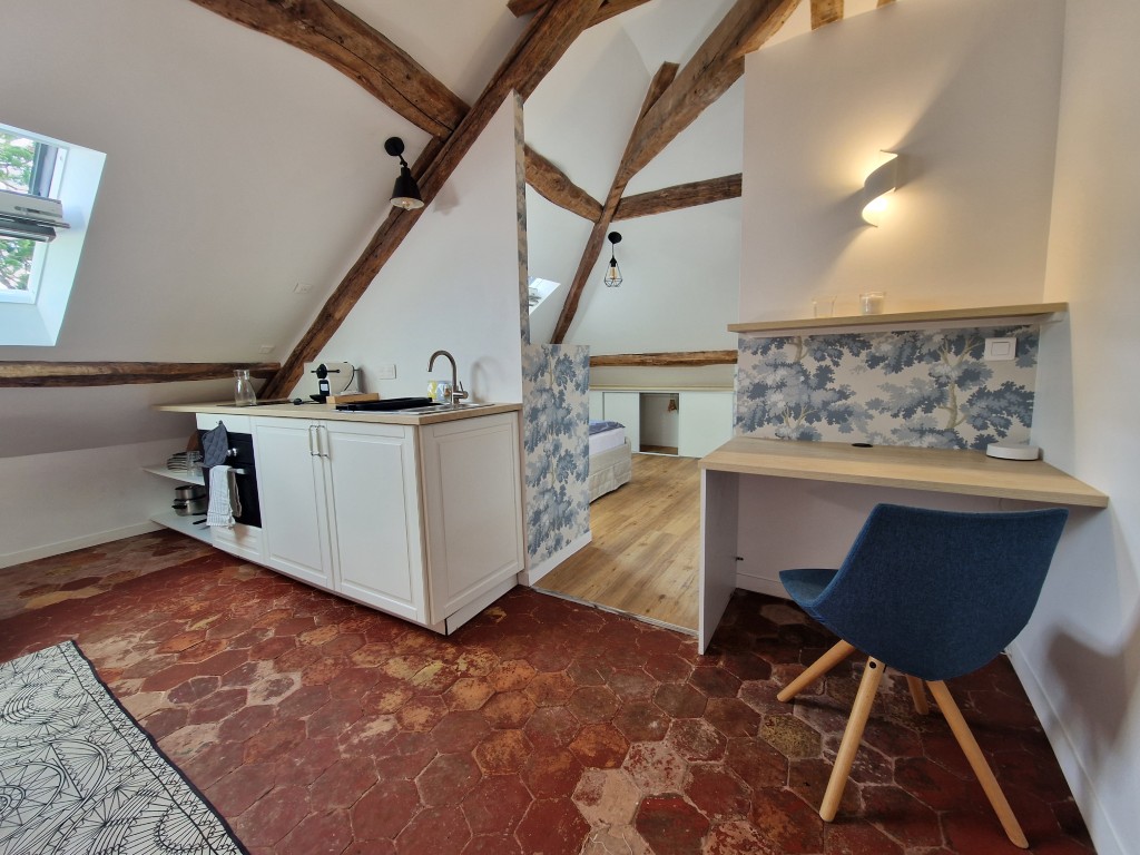 Set beneath beautiful exposed beams, this charming attic studio blends authentic architectural details with modern comfort. The living area is bathed in natural light thanks to the large roof window, creating a welcoming and uplifting atmosphere throughout the day. A cosy seating area, a dining area, and a dedicated workspace make the apartment perfectly suited for both study and relaxation.
