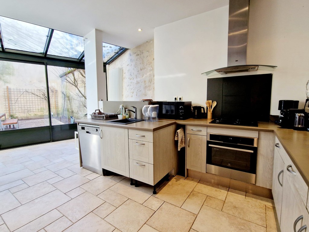 - Large kitchen and dining area overlooking a sunny terrace