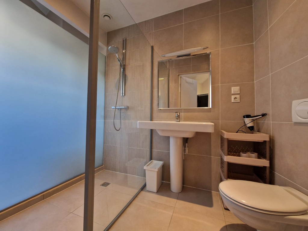 On the main floor, you’ll find a bright, airy living room – just right for unwinding or getting some work done in peace. The spacious kitchen and dining area open out onto a sunny terrace, where there’s a secure bike rack for peace of mind. There’s also a handy washroom on this floor too.